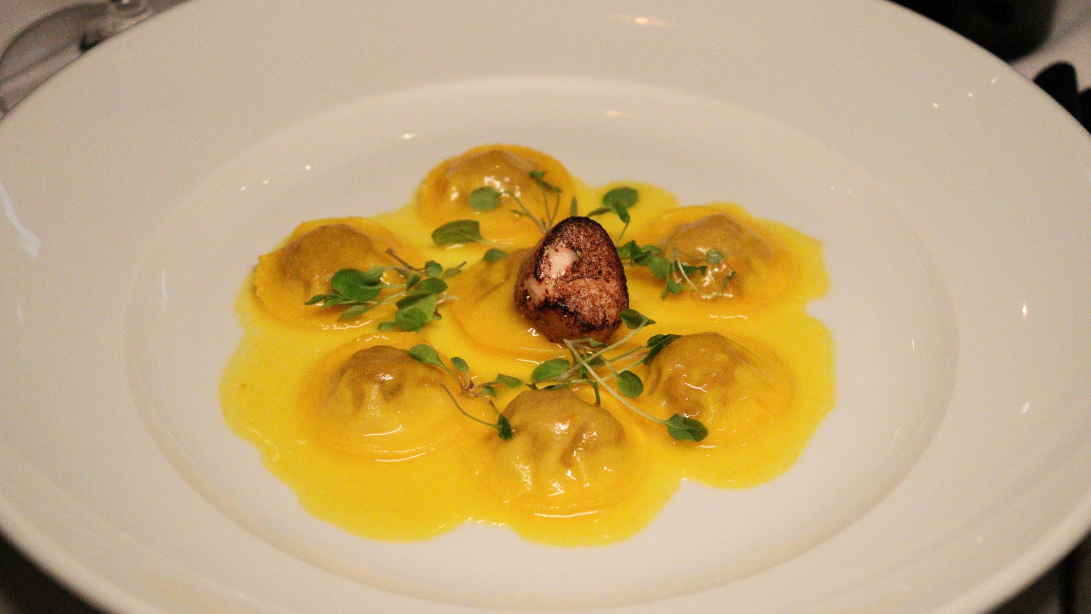 Massa recheada com Foie Gras de pato, marinado e assado em baixa temperatura, servida em molho de manteiga e redução de vinho do Porto, decorado com mostarda de cremona.